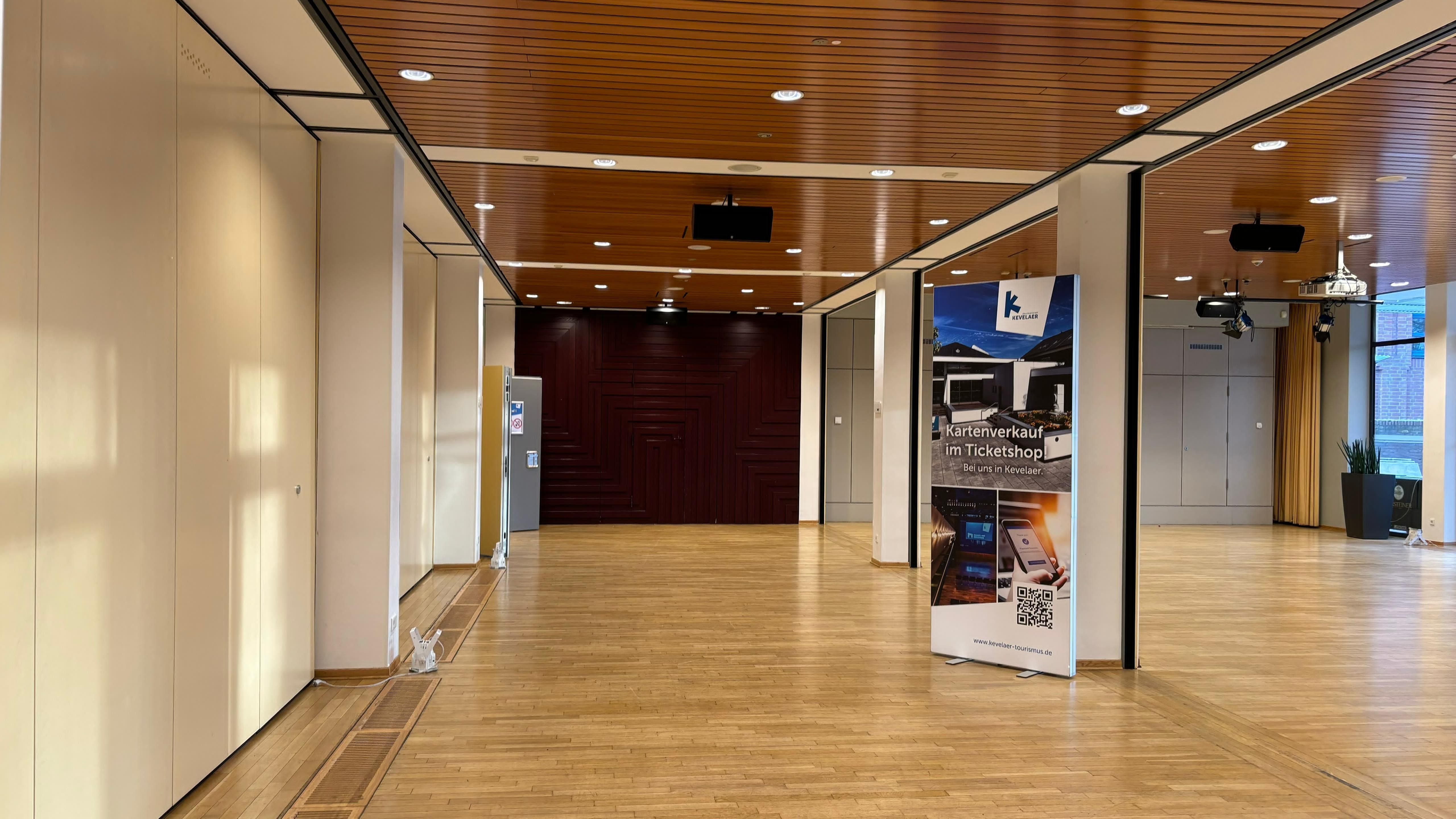 The event technology of the concert and stage house is optimally designed to meet the needs of customers. The fully equipped theater stage offers movable portal walls, lighting bridges and towers with the latest energy-saving LED spotlights, a high-quality sound system, several screens and projectors as well as a lifting podium with orchestra pit and dressing rooms for the artists. With the mobile stage elements, additional elevations can be built on the stage or in the hall. Stage sets, backdrops, screens or company banners can be installed on the movable tension rods.