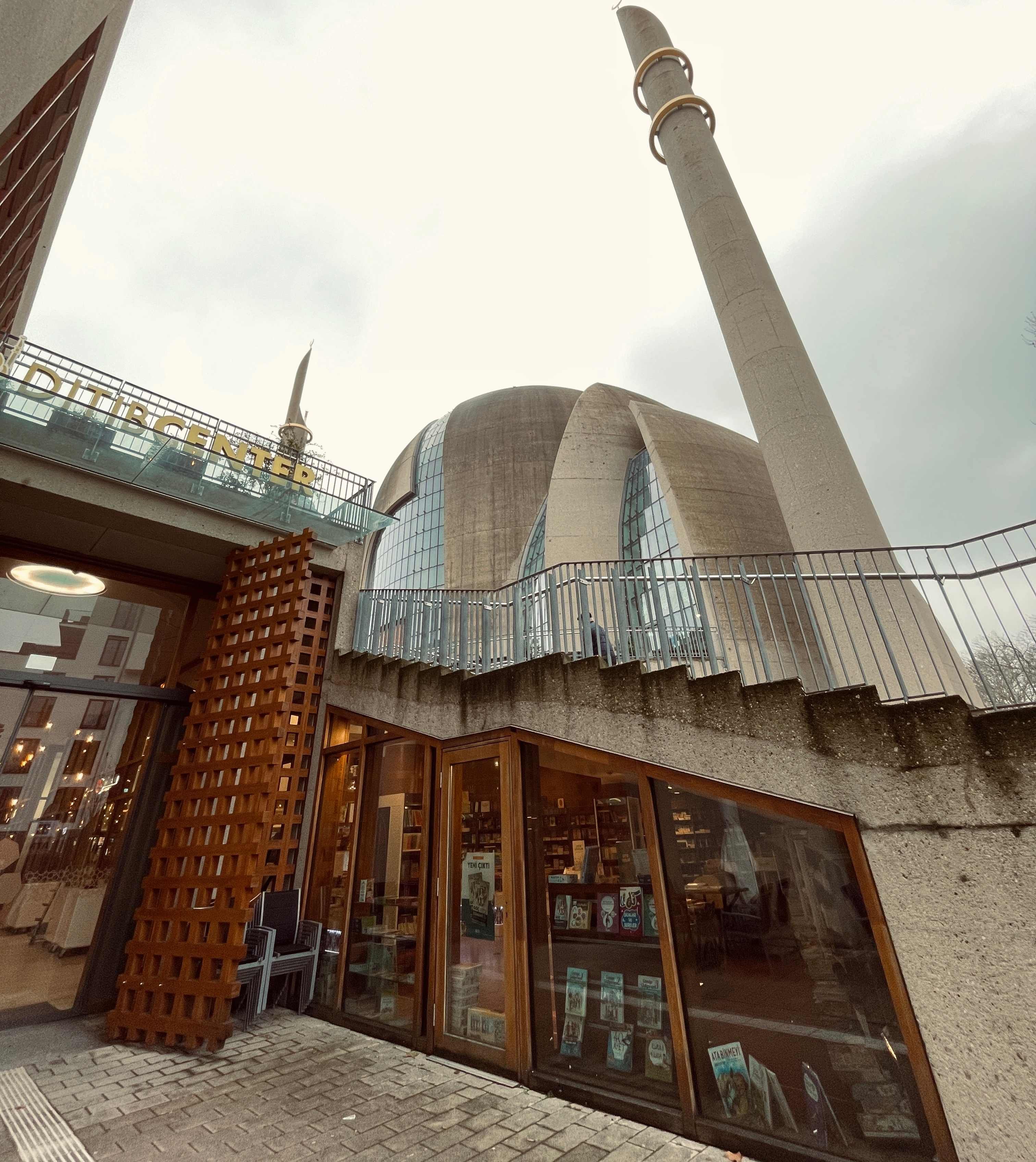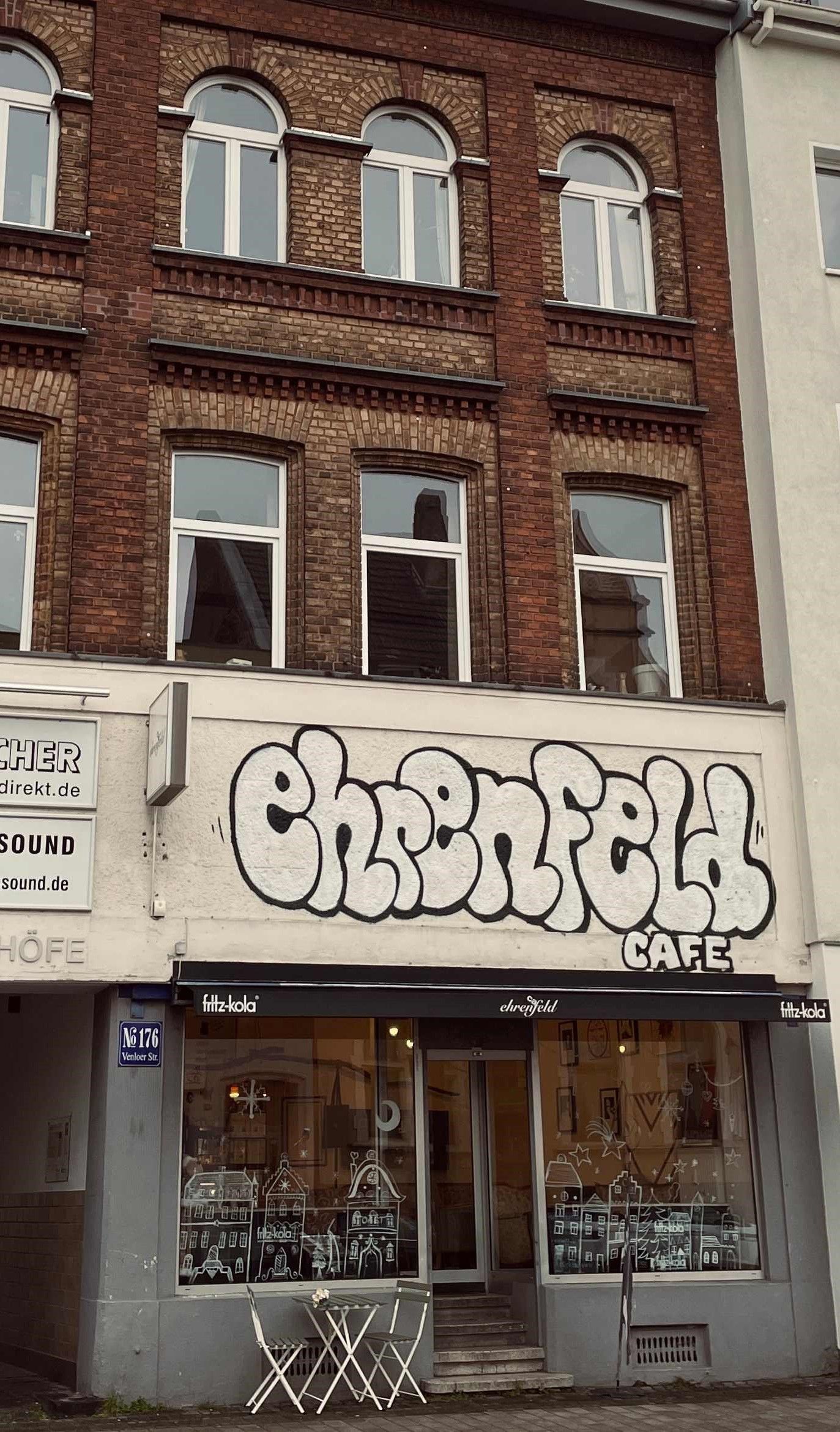 It's not far from the cemetery to the Cologne Grand Mosque. Its architecture and size are impressive. If you would like to visit the building, you can take part in a public guided tour. We marvelled at its size and strolled through the small shopping arcade, where you can find an ice cream parlour, bookshop and snack bar. Our first stop was the "Ehrenfeld Café" nearby, where we had Turkish coffee. And a slice of warm cake straight from the oven. Delicious. We warm up here briefly before continuing on. In the direction of Körnerstraße.