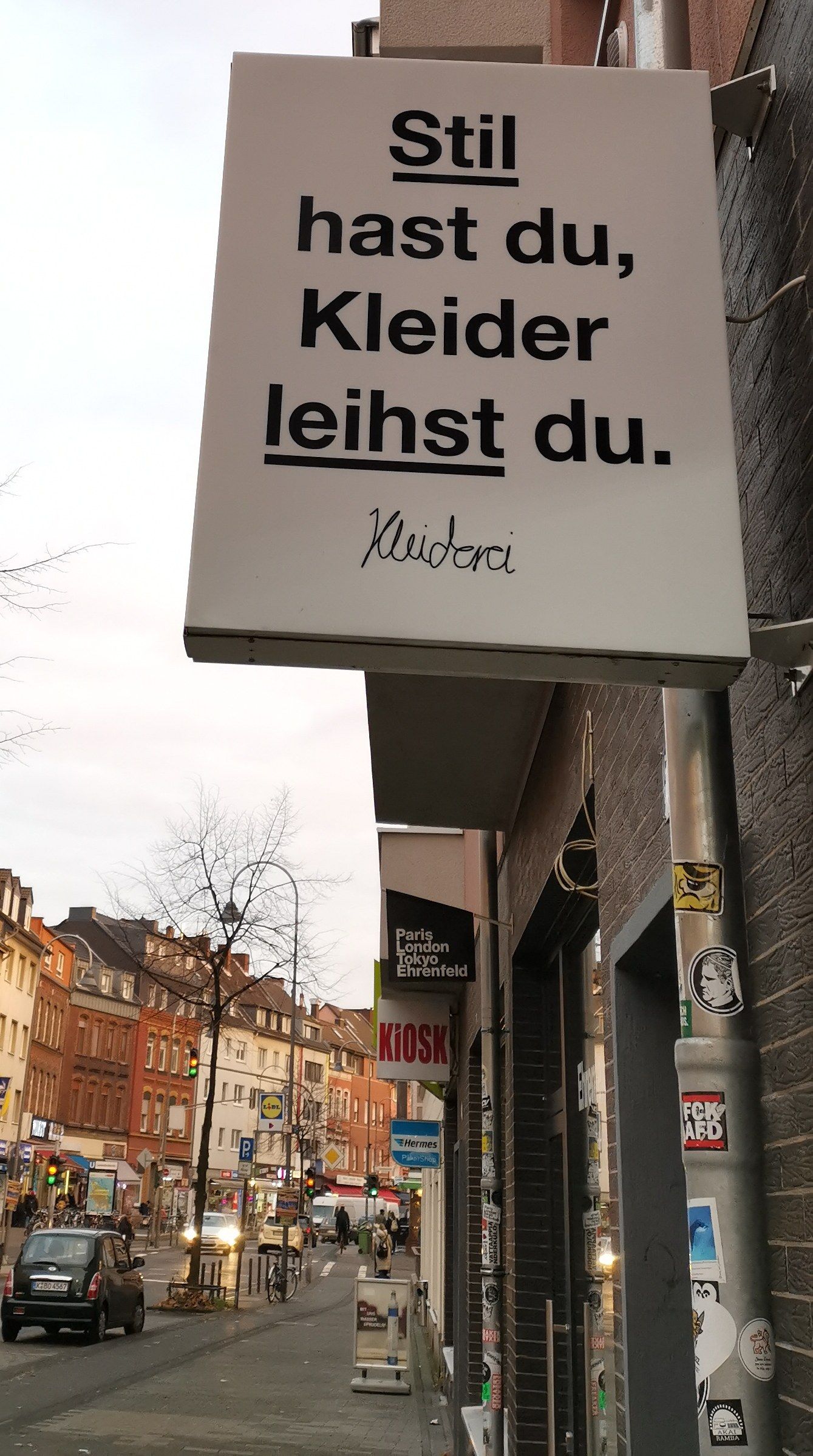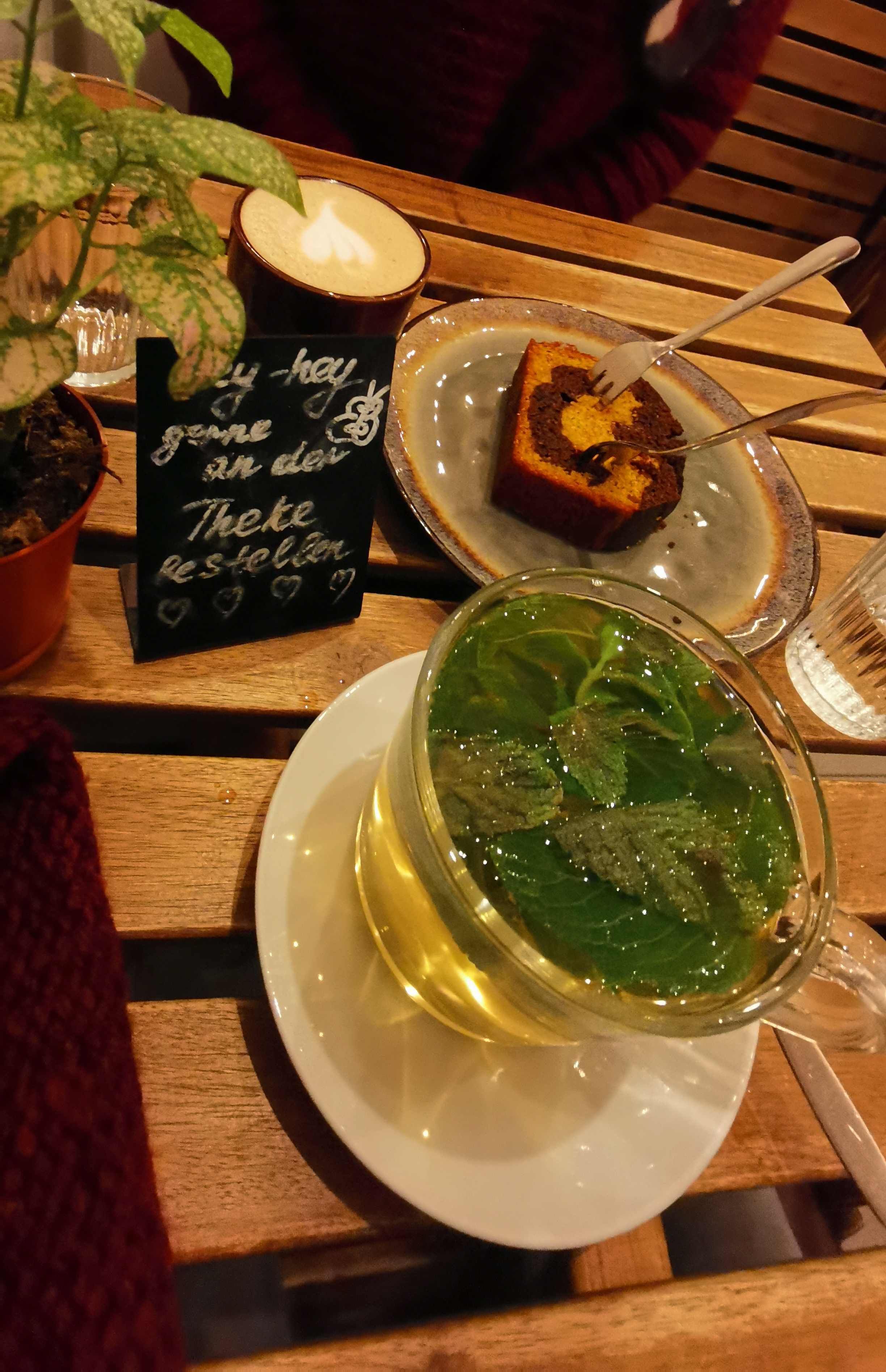 Refreshed, we stroll further down Venloer Straße. In the "Kleiderei", a second-hand shop, we have the shop's sustainable concept explained to us: You pay a monthly fee and borrow clothes in return, so you have variety in your wardrobe, but not a full wardrobe. As you can also buy clothes here, we briefly go into shopping mode. How about this jacket? Stop. We still want to see more of Ehrenfeld. And it's slowly getting dark. We think about coffee, tea and cake and go in search of something. Schamong, for example, is Cologne's oldest coffee roastery. However, we decide on "Ain Café" and drink fresh peppermint tea, cappuccino and share a slice of pumpkin chocolate cake.