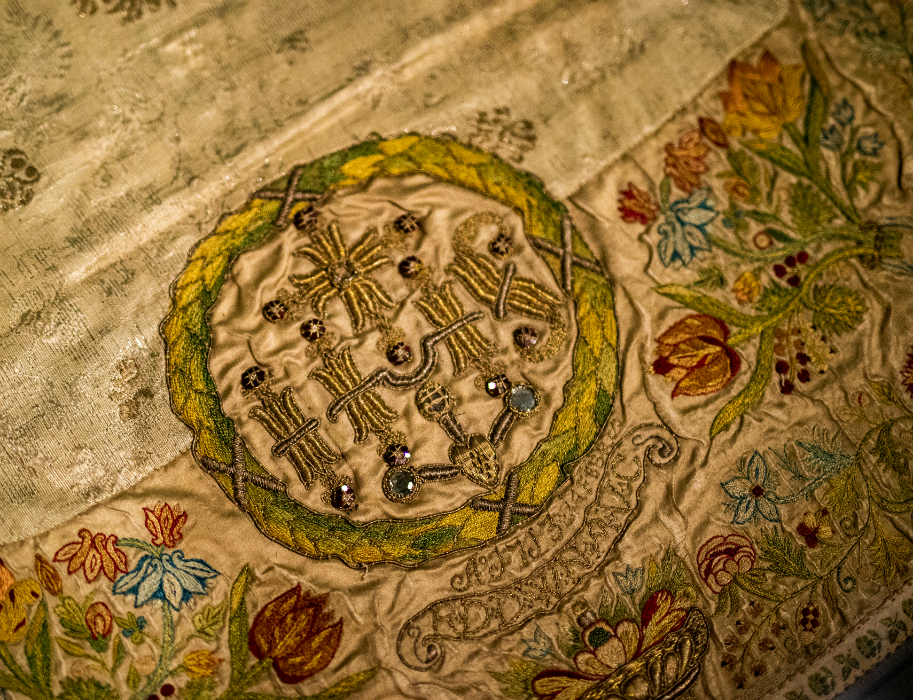 Artfully decorated chasubles, mitres and altar curtains in the treasury of Kamp Abbey