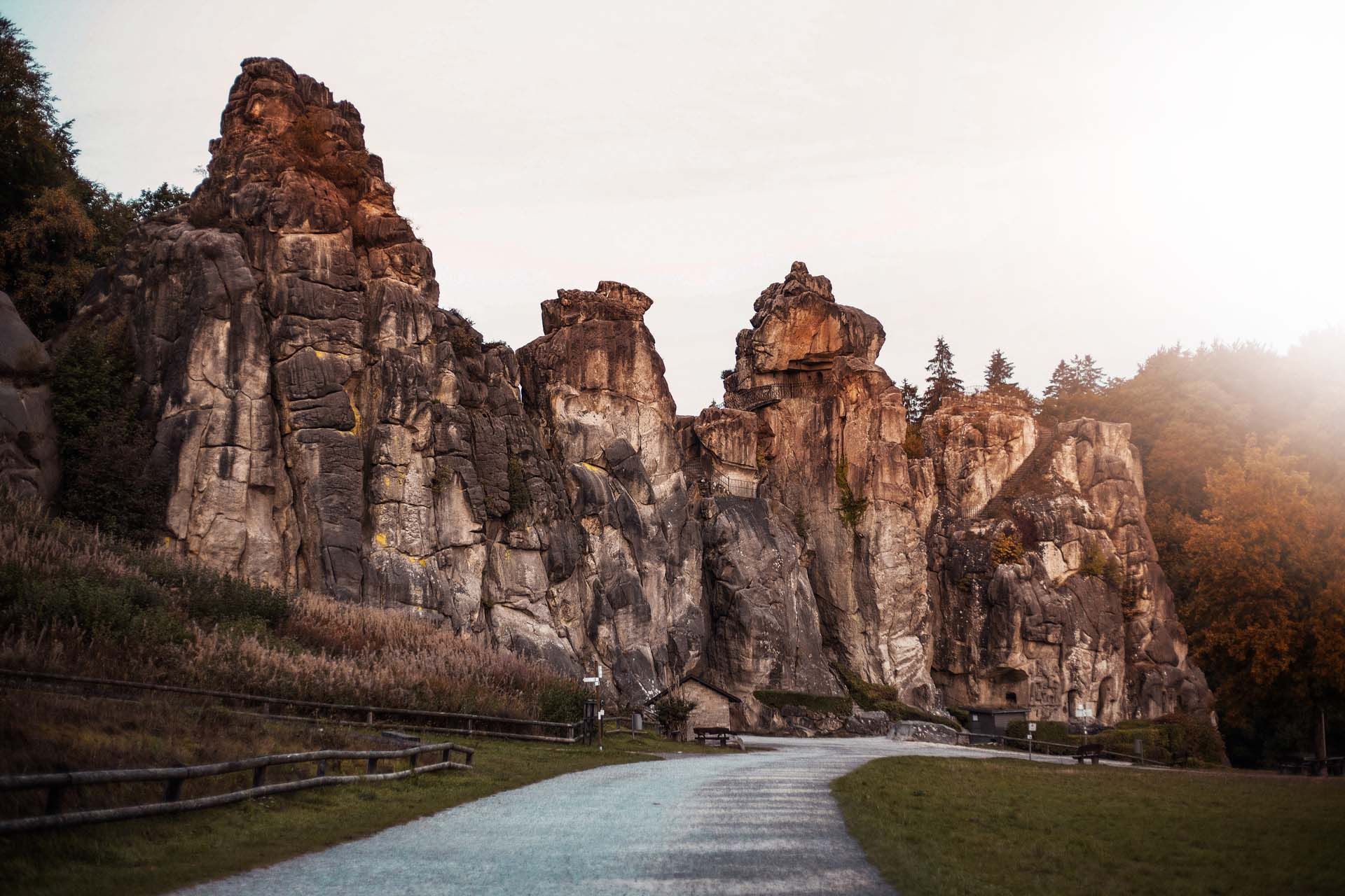 Meanwhile, down below, a group of young Englishmen take selfies of themselves and Arminius, who, according to legend, brought the Romans to their knees here. 9.5 kilometres and three hours later, I will see them again. Because after the descent, my real mission for the day begins: a hike on the Hermannshöhen, one of the Top Trails of Germany. I have set myself a section of stage 9, which is considered the most spectacular section of the 226-kilometre Hermann and Egge Trail. This is because it leads over the ridge of the Teutoburg Forest past the Externsteine, the 70-million-year-old rock formations that have been the subject of all kinds of myths and legends since time immemorial. That's exactly where I want to go.