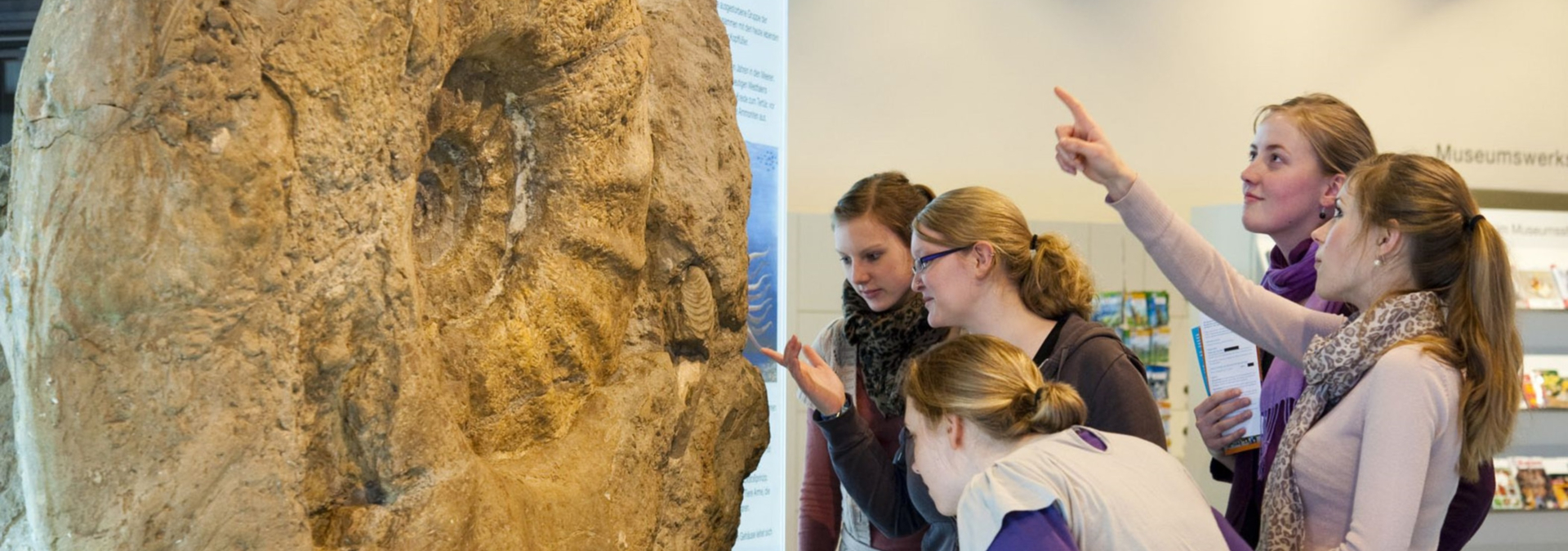In the permanent prehistoric exhibition, visitors stop in front of large skeletons. Their jaws drop when they look at the detailed models and real fossils of prehistoric animals. History buffs and amateur palaeontologists alike satisfy their curiosity at interactive stations. For example, they can watch an informative educational film before moving on to rare swimming dinosaurs or the skeletons of sperm whales.