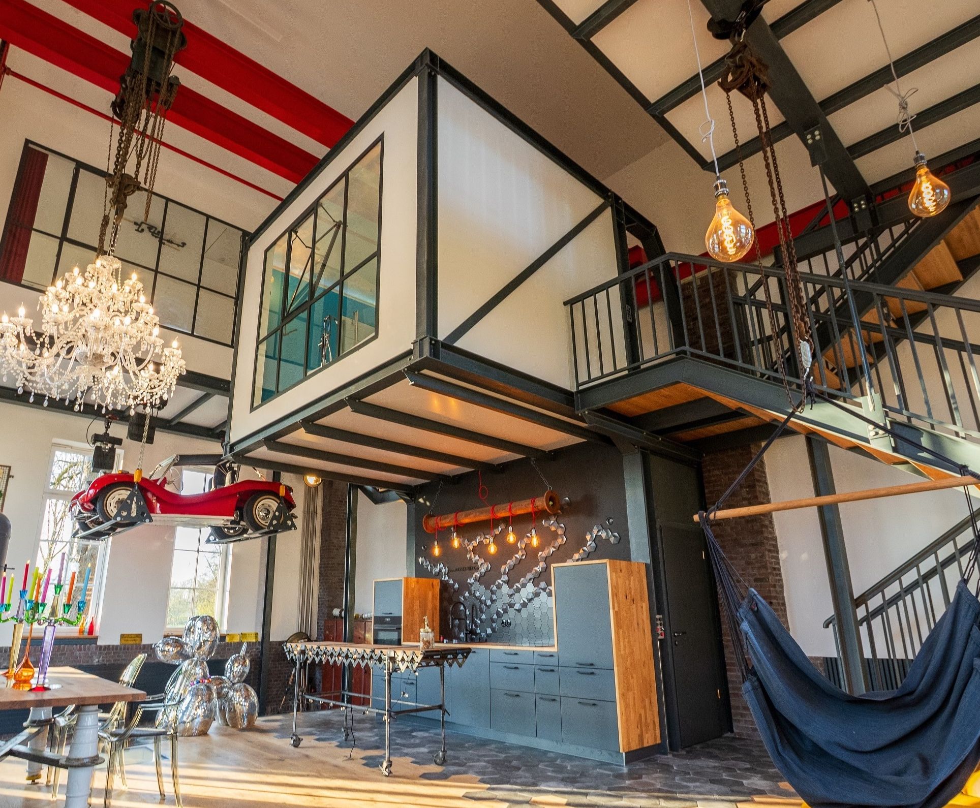 Tecklenburg Learn moreThe two holiday flats in the Tecklenburg waterworks are both historic and ultra-modern. Behind the 100-year-old sandstone walls of the former waterworks are two comfortably furnished lofts that combine design pieces and industrial charm. High ceilings, large windows and eye-catching features in the bathroom and living room make this time-out wonderfully different. For example, the kitchen and dining table in one flat are made from historical workbenches, while in the other, a bathroom with a free-standing bathtub is an eye-catching feature.