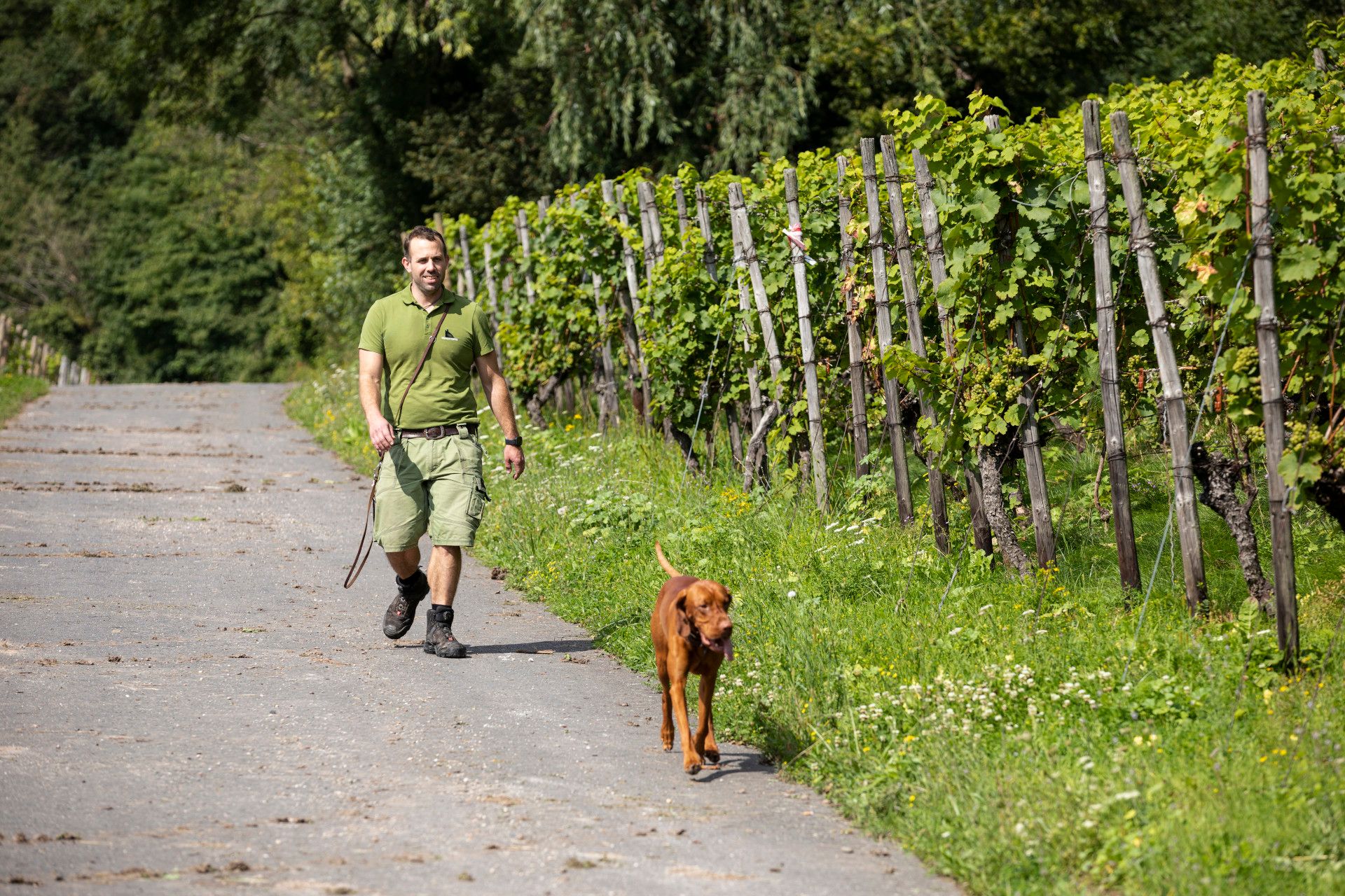 Which is why the family has refrained from using pesticides or herbicides in cultivation for years. Instead, nature is allowed to run riot between the vines and grow wild. Janos, whom they all call Möhrchen because of his reddish colouring, likes it. Back in the steep vineyard, he hunts for mice. While his master tells him how he himself grew into the profession of winegrower. Knowing full well how exhausting it can be to have to go up and down the steep hills every day in all weathers. "After leaving school," recalls the 38-year-old, "I briefly considered studying architecture." However, he quickly discarded the idea. Instead, he learnt all about soil composition, fermentation processes and agricultural technologies in the Rheingau and then "took off" to New Zealand for a while, only to soon return to Königswinter and continue running his parents' winery. "I love the Siebengebirge," he says and a smile crosses his friendly face. "Especially since we got Janos." Since then, the well-trained winegrower has learnt almost all the hiking trails in the region and is always amazed anew at "how beautiful my home is".