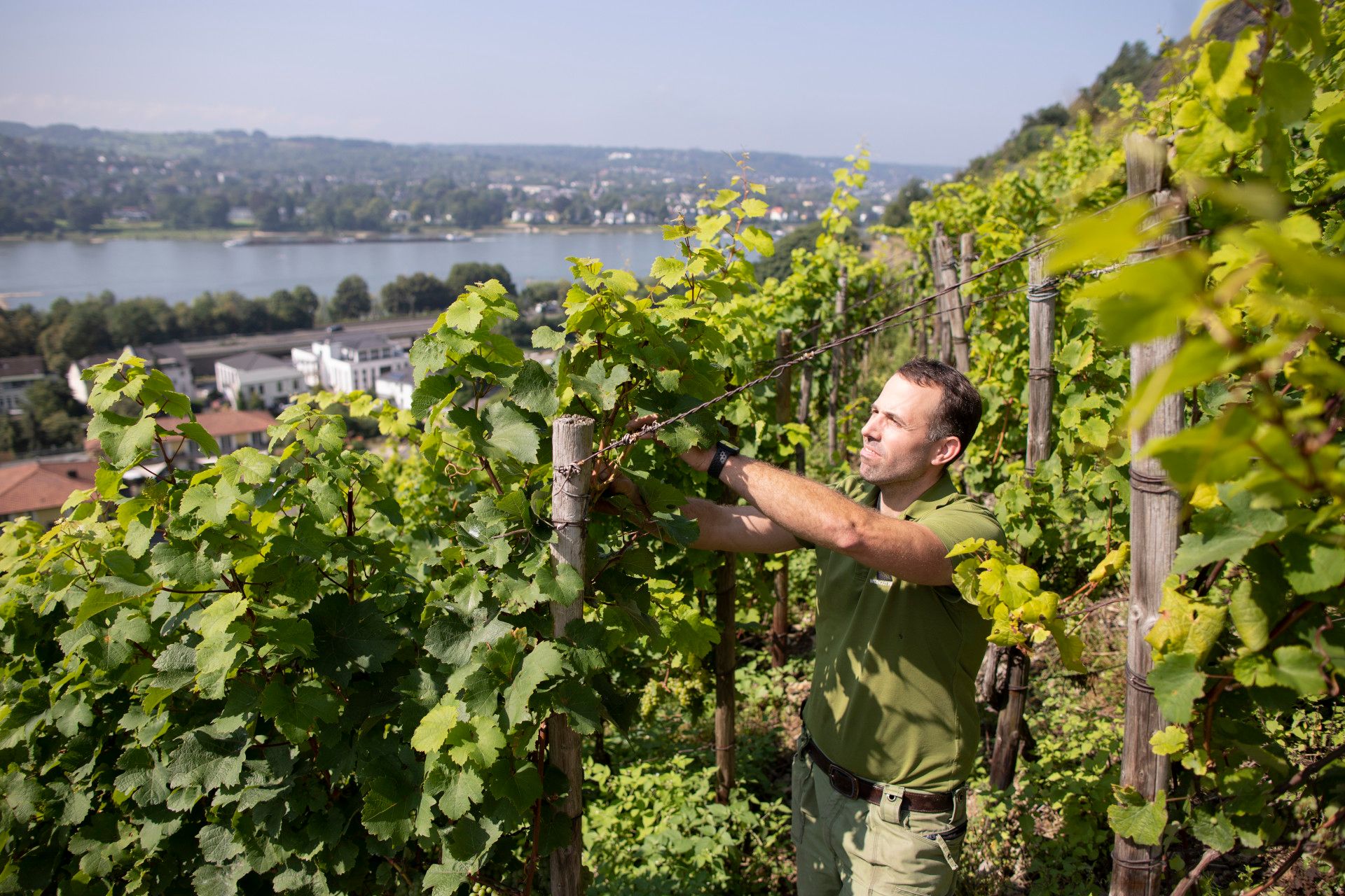 The early morning fog has lifted. The sun is slowly coming out and Germany's most northerly vineyards are glowing in lush green. The vines stand in rows below the legendary rock. A glorious late summer's day announces itself as Felix Pieper checks the "health" of the grapes, as he does every morning. The 38-year-old winemaker is satisfied. "Everything is fine." The heavy rainfall of the past weeks and months has not harmed the vines, most of which are more than 40 years old. Fortunately. "It's important that the grapes dry out quickly," explains the junior manager of the Piepers winery in Königswinter near Bonn. "Otherwise fungi will form."