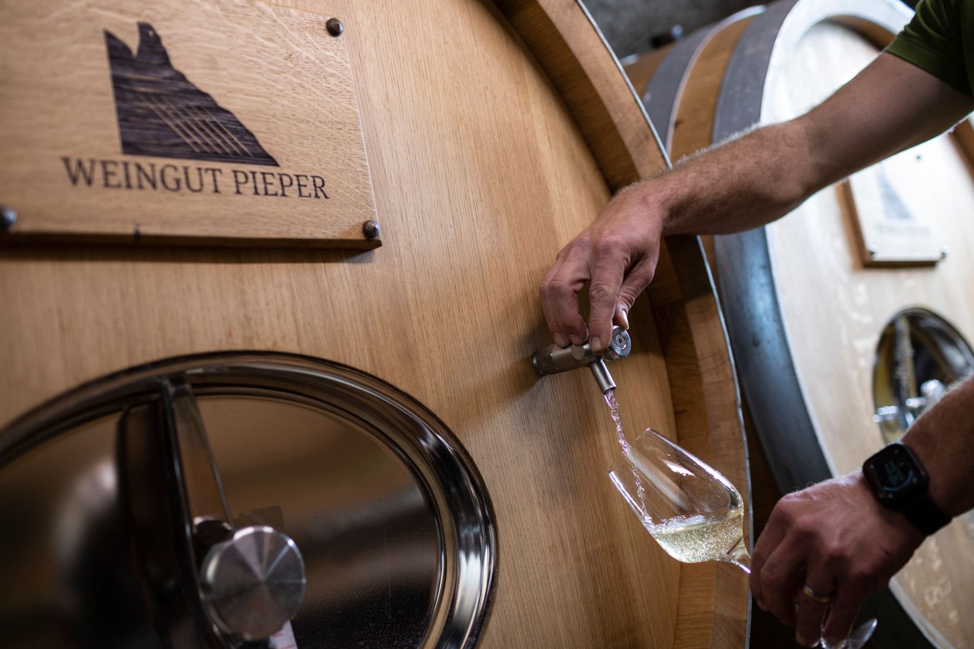 The well-coordinated team is almost a little restless, and it's not until later that the dog relaxes a little in the sun on the terrace. While Felix Pieper has "the rest" to do. The smartphone keeps ringing. Appointments are made, deliveries arranged and events planned. After all, the man with a pendant labelled Riesling dangling from his thick bunch of keys is not only a winemaker, but also a businessman. Albeit a modest one. He produces 110,000 to 120,000 bottles of mostly white wine a year. However, they are marketed exclusively in the region. And in his own wine shop, which is currently open by appointment.