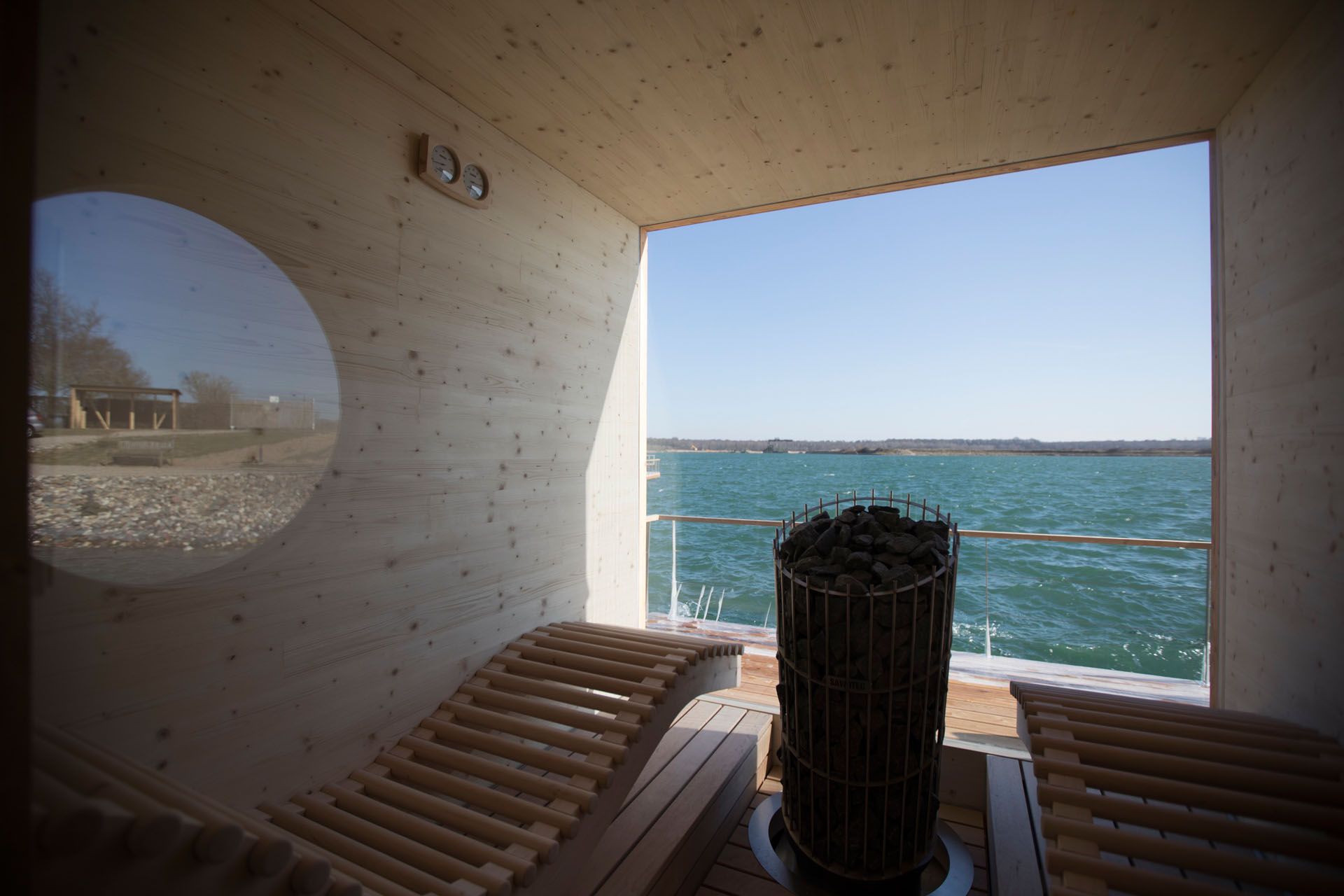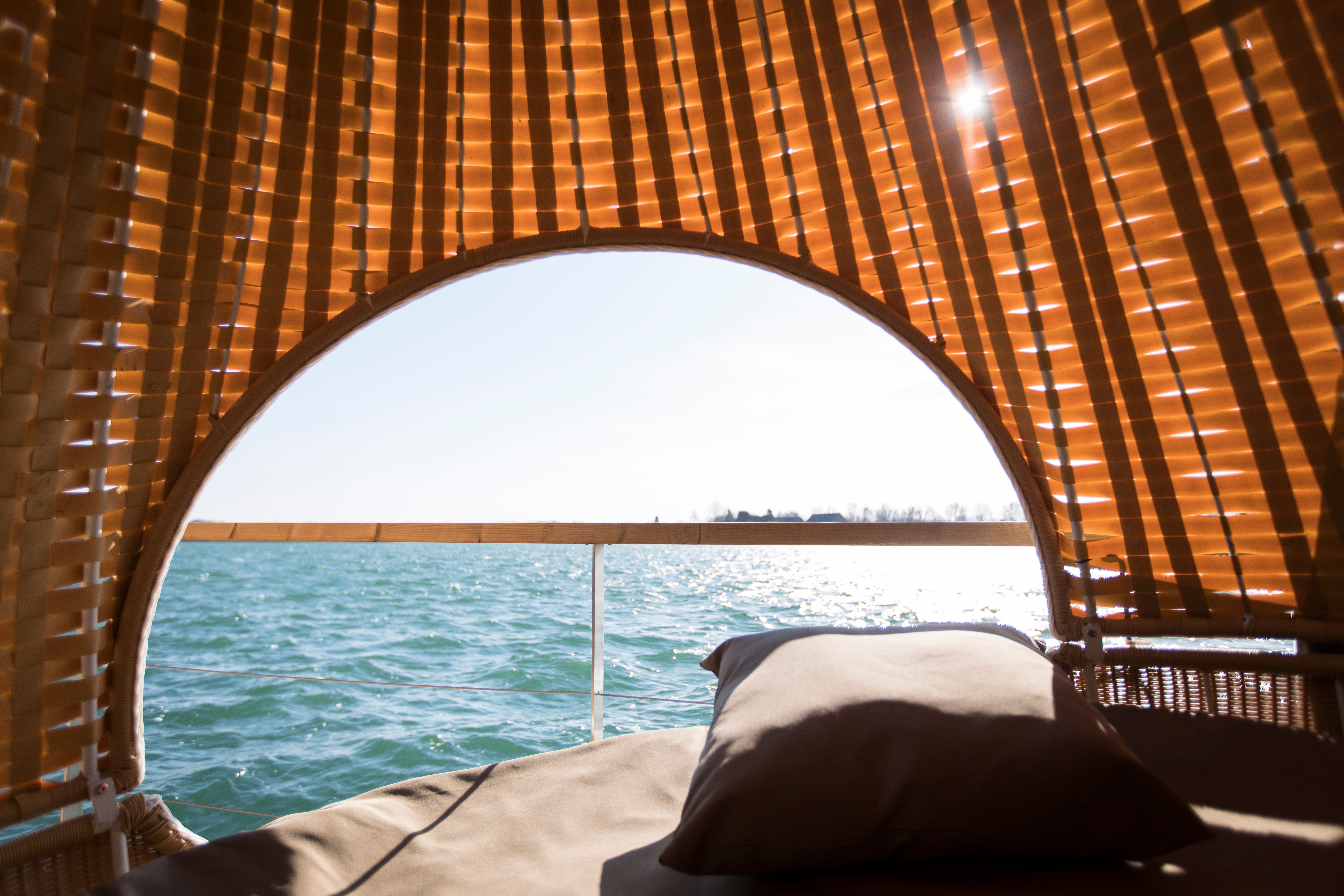 Binoculars are therefore standard equipment on the five houseboats floating on huge pontoons, which are built exclusively from natural materials such as Siberian lark wood. "It practically impregnates itself," explains the landlord as you enter the spacious rooms overlooking the lake. The sun shines through a porthole at the side and the large panoramic windows in front of the terrace, from where guests can jump straight into the water or enjoy the dusk in the cosy hanging chairs. There is even a private jetty right next to the floating holiday home. And when it gets chilly, holidaymakers can sweat in their own private sauna while overlooking the action on the water.